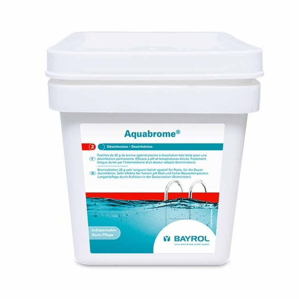 Aquabrome® assure une désinfection optimale même si le PH augmente (entre 7 et 7,6) ou si la température dépasse 30°C. Les pastilles d'Aquabrome® se dissolvent très lentement et doivent être placées dans un doseur adapté ( brominateur)
