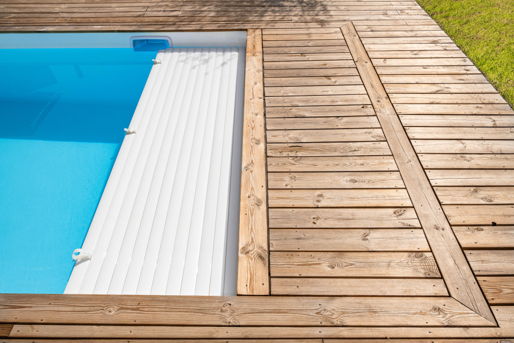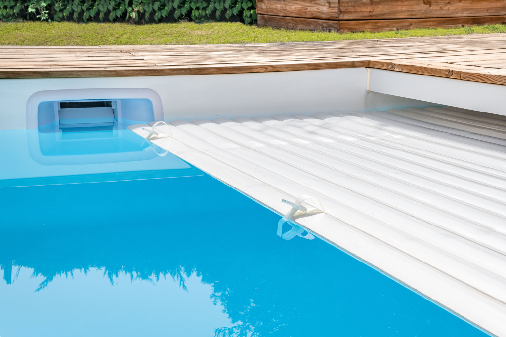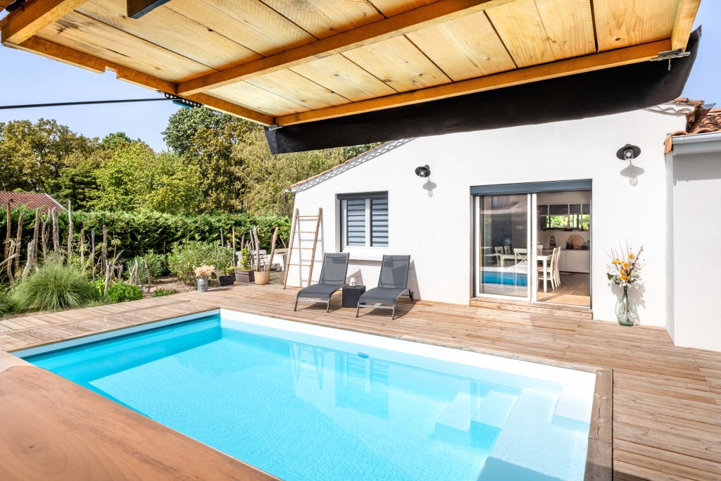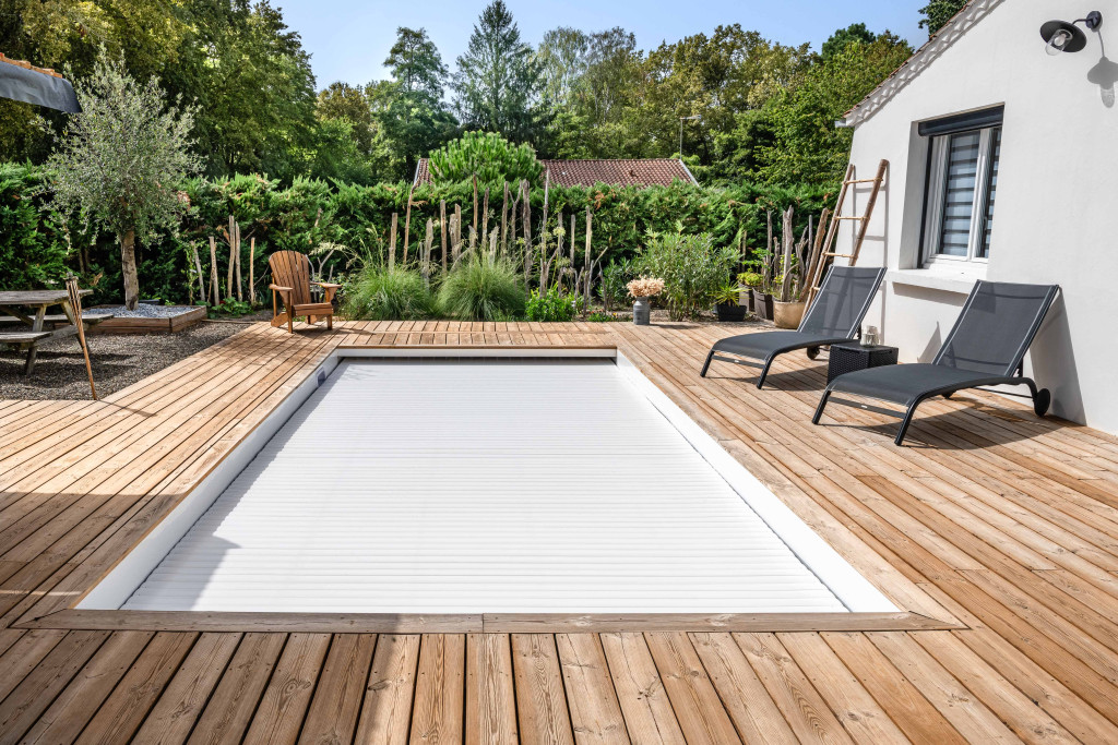 Elle dispose d’un coffre de volet immergé discret, intégré sous la plage afin de préserver l’esthétique du bassin.